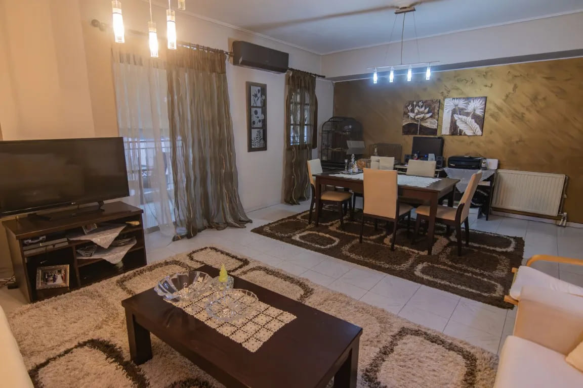 Αποτελείται από ευρύχωρο σαλόνι, ενιαία κουζίνα, δύο άνετα υπνοδωμάτια με ντουλάπες, μπάνιο με αποθηκευτικό χώρο (πατάρι), ένα ευρύχωρο μπαλκόνι με τέντα στο εμπρός μέρος της οικοδομής και ένα μικρότερο λειτουργικό στο πίσω μέρος. Διαθέτει αποθήκη στο υπόγειο και άνετη θέση parking στην πυλωτή. Η θέρμανση του γίνεται με ατομικό φ/α.