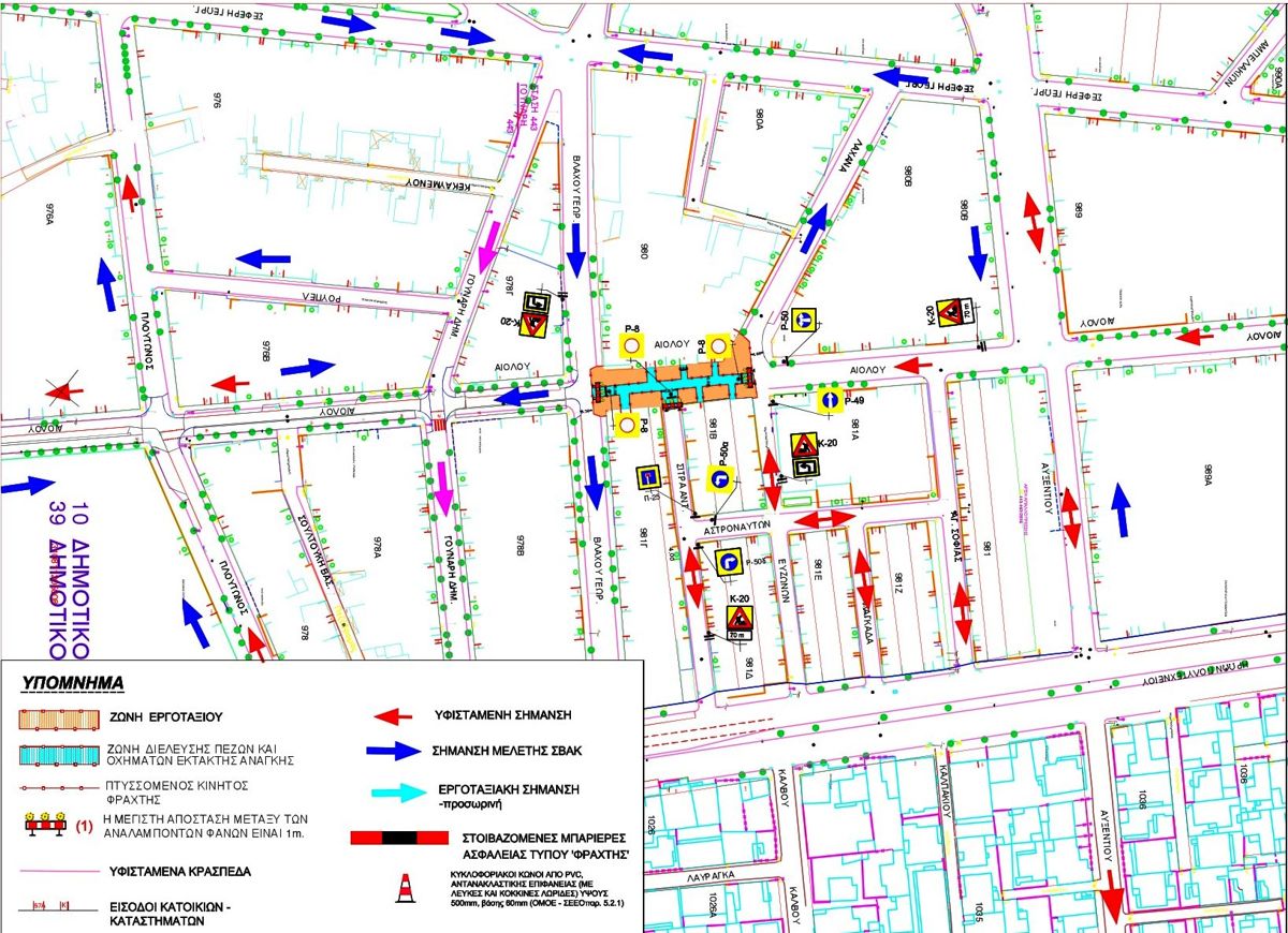 Για τους λόγους αυτούς θα εφαρμοστούν προσωρινές κυκλοφοριακές ρυθμίσεις, σύμφωνα με την εγκεκριμένη μελέτη, ενώ θα εφαρμοστεί ολική απαγόρευση της κυκλοφορίας και της στάθμευσης των οχημάτων στην οδό Αιόλου (από την οδό Γ. Βλάχου έως την οδό Αυξεντίου). Η κυκλοφορία των οχημάτων θα διεξάγεται σύμφωνα με τις προβλεπόμενες πληροφοριακές και ρυθμιστικές πινακίδες που θα τοποθετηθούν από τον ανάδοχο του έργου.