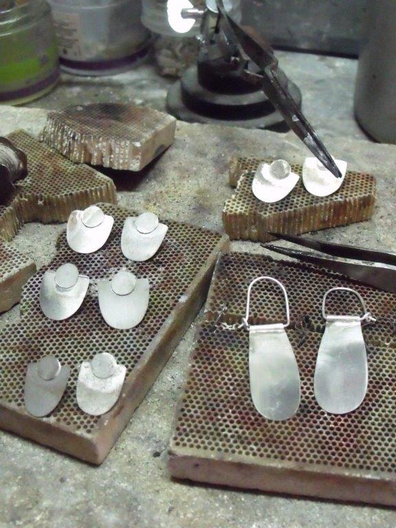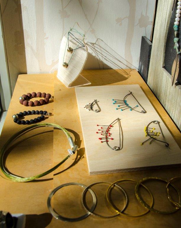 Στο εργαστήριο σχεδιάζουμε και κατασκευάζουμε κοσμήματα με πολύ ιδιαίτερες λεπτομέρειες κυρίως από ασήμι, το οποίο συνδυάζουμε έξυπνα και ευρηματικά με ημιπολύτιμους λίθους, υφάσματα, καουτσούκ, νήματα, δαντέλες, σμάλτο, σε μοντέρνο αλλά και πιο κλασικό ύφος φροντίζοντας τα σχέδιά μας να ανανεώνονται συνεχώς.