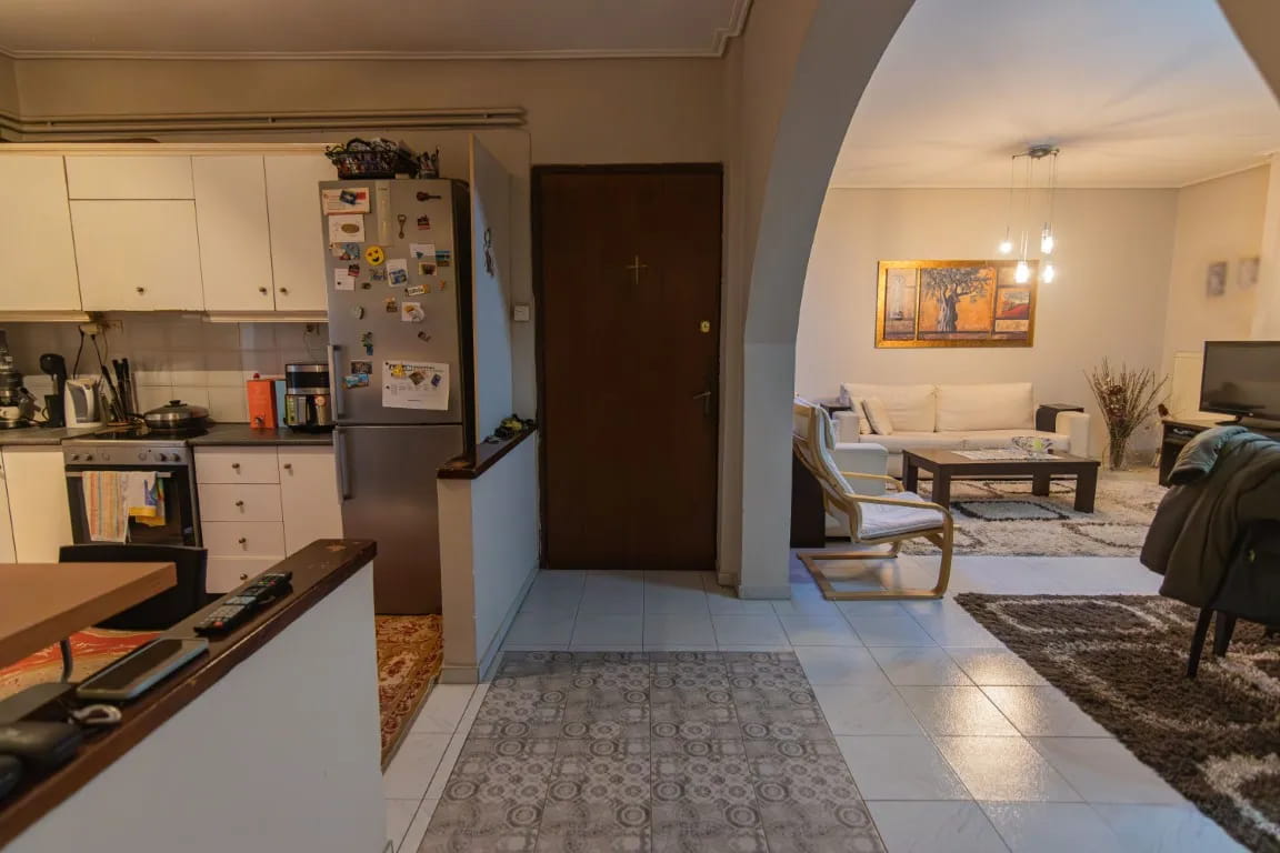 Αποτελείται από ευρύχωρο σαλόνι, ενιαία κουζίνα, δύο άνετα υπνοδωμάτια με ντουλάπες, μπάνιο με αποθηκευτικό χώρο (πατάρι), ένα ευρύχωρο μπαλκόνι με τέντα στο εμπρός μέρος της οικοδομής και ένα μικρότερο λειτουργικό στο πίσω μέρος. Διαθέτει αποθήκη στο υπόγειο και άνετη θέση parking στην πυλωτή. Η θέρμανση του γίνεται με ατομικό φ/α.