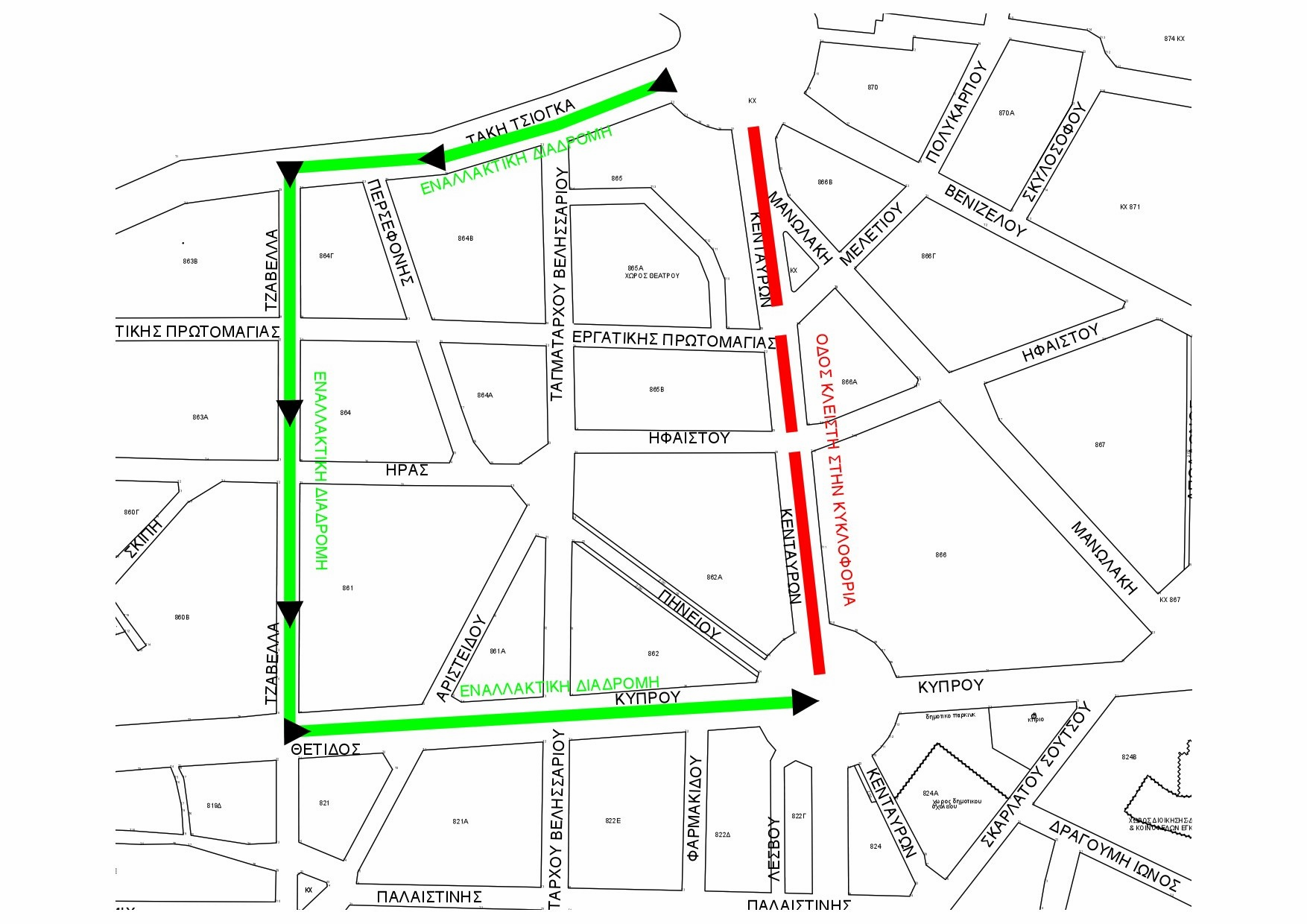 Κατά τη διάρκεια των εργασιών στην οδό Κενταύρων, η κυκλοφορία των οχημάτων θα διεξάγεται σύμφωνα με τις προβλεπόμενες πληροφοριακές και ρυθμιστικές πινακίδες που θα τοποθετηθούν από τον ανάδοχο του έργου και ενδεικτικά μέσω των οδών Τσιόγκα – Τζαβέλλα – Κύπρου – Ανθ. Γαζή, ώστε να παρακαμφθεί το τμήμα που θα είναι κλειστό στην κυκλοφορία.