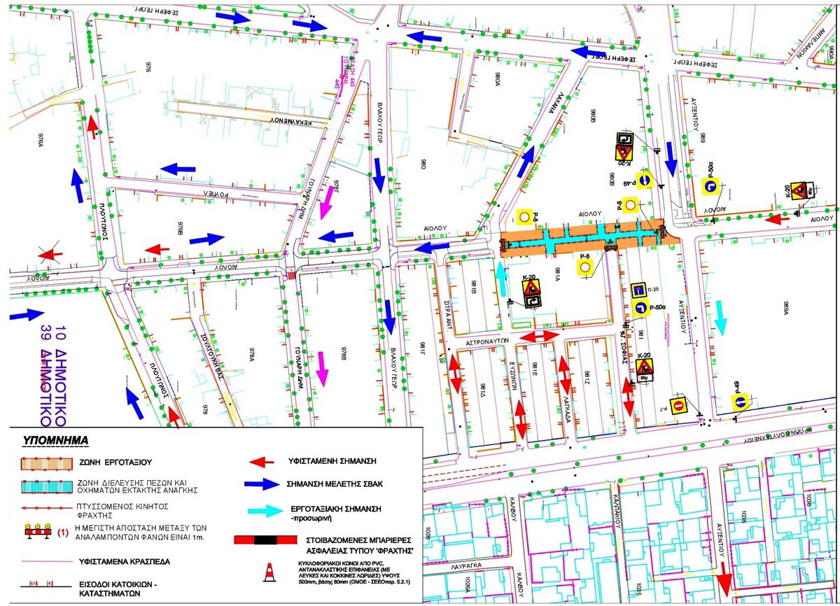 Για τους λόγους αυτούς θα εφαρμοστούν προσωρινές κυκλοφοριακές ρυθμίσεις, σύμφωνα με την εγκεκριμένη μελέτη, ενώ θα εφαρμοστεί ολική απαγόρευση της κυκλοφορίας και της στάθμευσης των οχημάτων στην οδό Αιόλου (από την οδό Γ. Βλάχου έως την οδό Αυξεντίου). Η κυκλοφορία των οχημάτων θα διεξάγεται σύμφωνα με τις προβλεπόμενες πληροφοριακές και ρυθμιστικές πινακίδες που θα τοποθετηθούν από τον ανάδοχο του έργου.