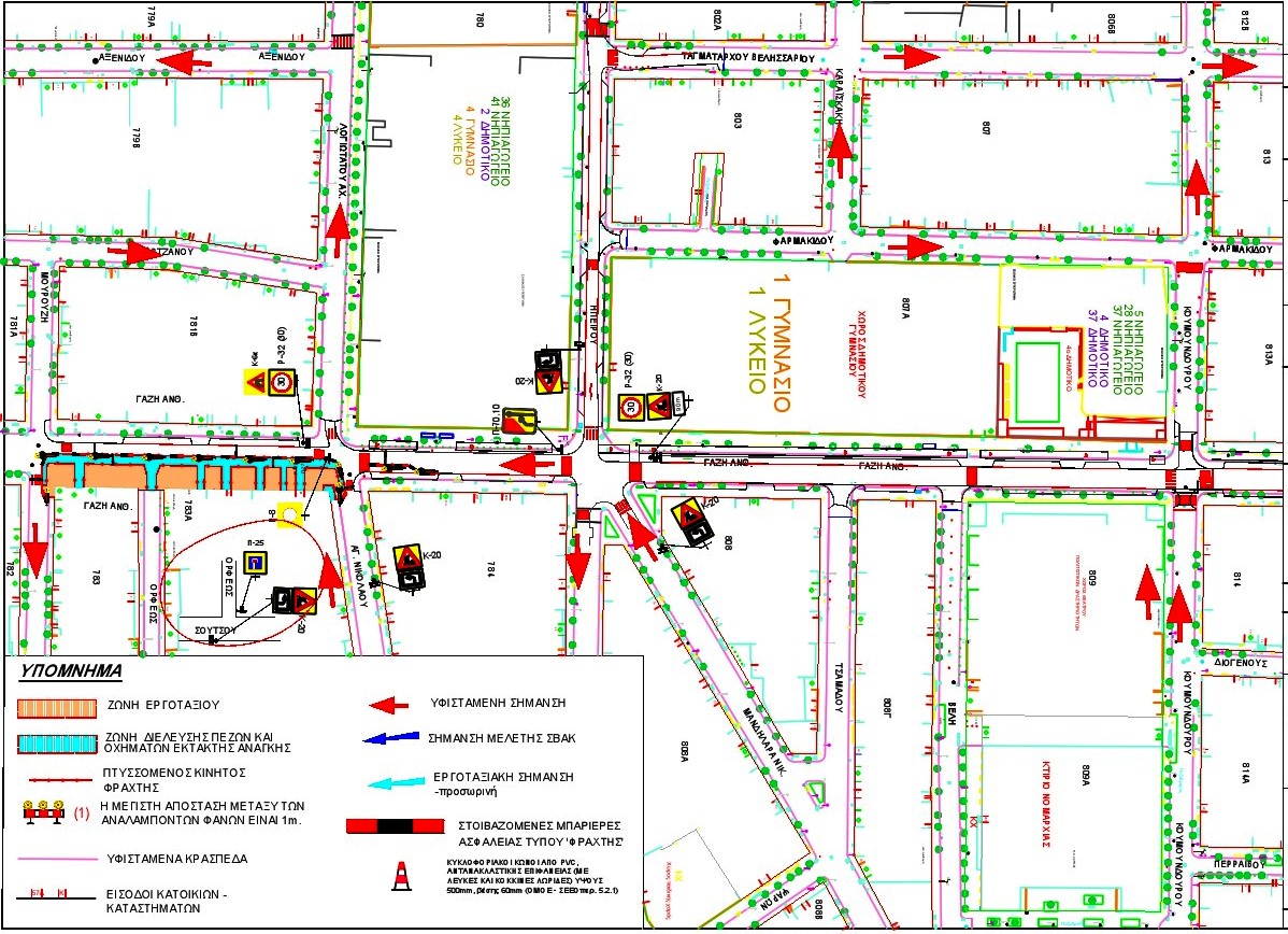 Κατά τη διάρκεια των εργασιών στην οδό Ανθίμου Γαζή, η κυκλοφορία των οχημάτων θα διεξάγεται σε μία λωρίδα κυκλοφορίας πλάτους 3,50μ (τοπική μείωση των λωρίδων κυκλοφορίας από δύο σε μία, λόγω της στένωσης του οδοστρώματος στην αριστερή πλευρά της οδού κατά τη φορά κίνησης των οχημάτων από την οδό Αγίου Νικολάου προς την οδό Μουρούζη) και θα γίνεται σύμφωνα με τις προβλεπόμενες πληροφοριακές και ρυθμιστικές πινακίδες που θα τοποθετηθούν από τον ανάδοχο του έργου.