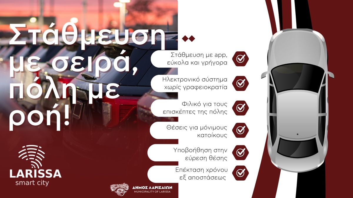 Το Σ.Ε.Σ. θα τεθεί σε εφαρμογή στις 2 Ιουνίου 2025, σε πρώτη φάση σε συνολικά 17 οδούς (μπλε δίκτυο), στο κέντρο της Λάρισας. Ταυτόχρονα, ενεργοποιούνται οι θέσεις μονίμων κατοίκων, στις αντίστοιχες ζώνες.