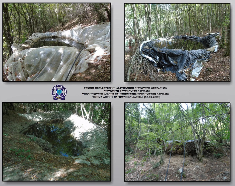 Στον χώρο υπήρχε δίκτυο άρδευσης με λάστιχα εκατοντάδων μέτρων και αυτοσχέδιες δεξαμενές νερού, ενώ βρέθηκαν φορητοί ασύρματοι επικοινωνίας, οικιακά σκεύη, καλλιεργητικά εργαλεία και άλλα αντικείμενα.