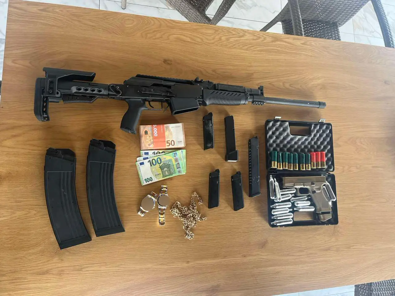 Κατά την επιχείρηση, πραγματοποιήθηκαν έρευνες στις οικίες των κατηγορούμενων, όπου βρέθηκαν λίρες αμφιβόλου γνησιότητας, όπλα, πολυτελή οχήματα, χρυσαφικά, ναρκωτικά και αναβολικά χάπια. Επιπλέον, συνελήφθη και ένα συγγενικό πρόσωπο των κατηγορούμενων, καθώς στην οικία του βρέθηκαν όπλα, φυσίγγια κ.α. αντικείμενα.