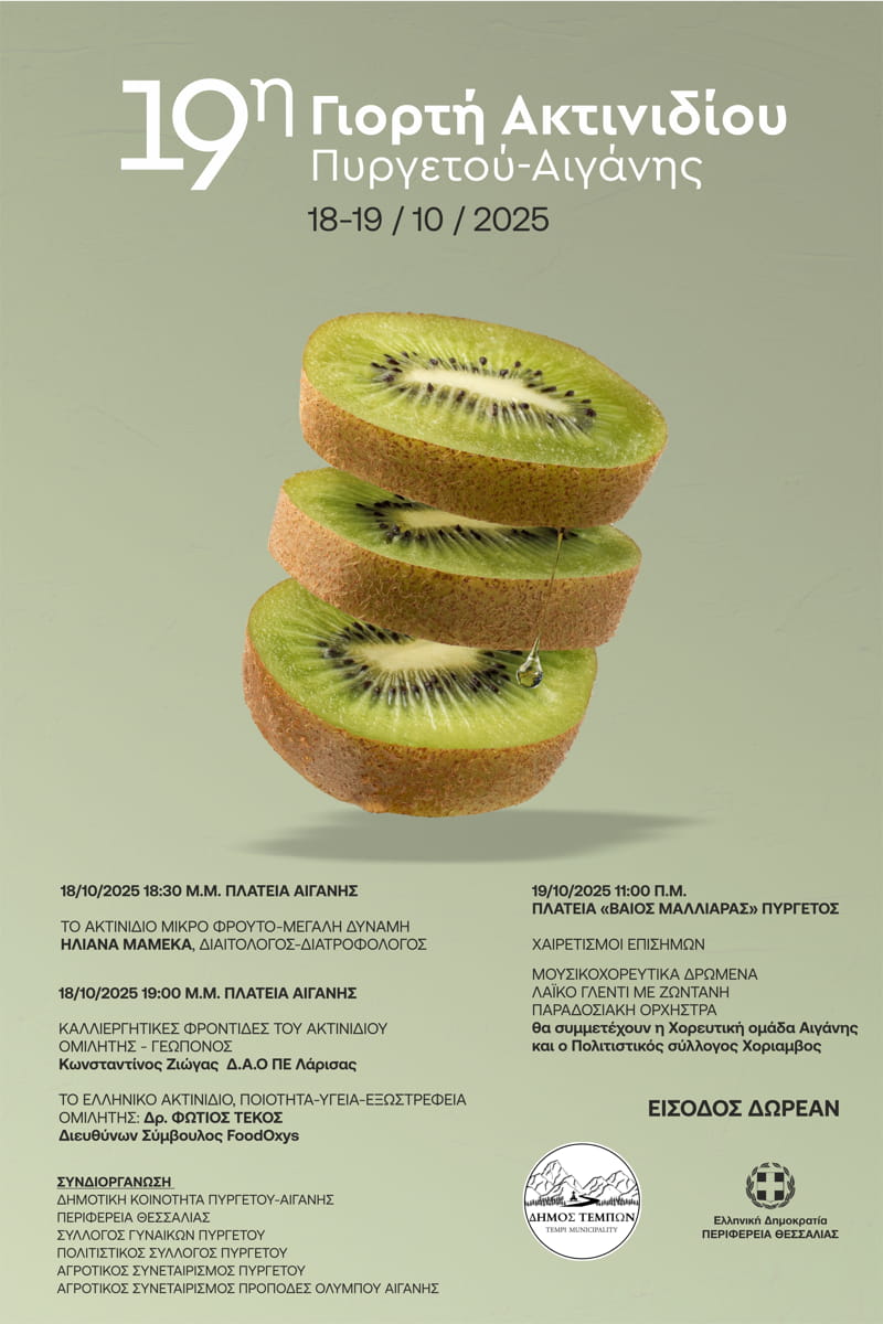 Σας περιμένουμε να επισκεφθείτε τον Δήμο Τεμπών, να δοκιμάσετε εδέσματα με βασικό συστατικό το ακτινίδιο και να γνωρίσετε από κοντά την Αιγάνη και τον Πυργετό — περιοχές όπου οι άνθρωποι, με κόπο και μεράκι, καλλιεργούν την ευλογημένη γη, παράγοντας ποιοτικά ακτινίδια που ταξιδεύουν σε Ευρώπη, Αμερική και την Ασία.
